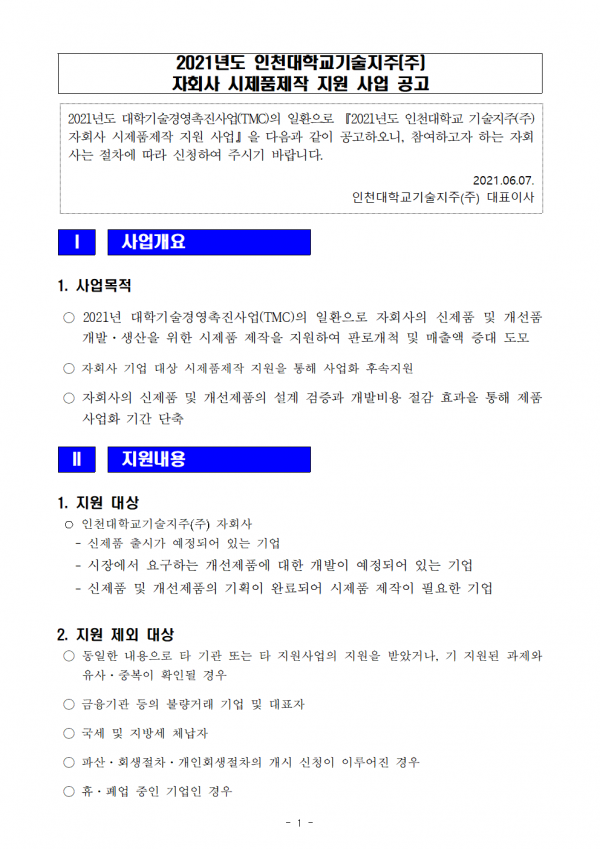 1. 2021년도 인천대학교기술지주주 자회사 시제품제작 지원 신청서.hwp (17.0K)